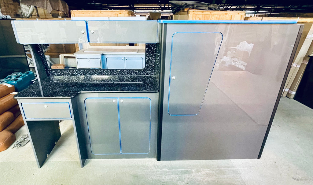 VW T5/T6 Campervan Kitchen Units – Gloss Grey + Black Sparkle Worktop + Blue Trim – SWB/LWB